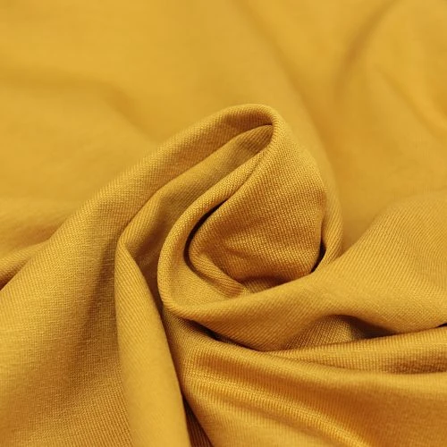 BASIC STRETCH JERSEY aus Tencel™ Lyocell Fasern ist ein exklusives, glattes und seidig weiches Single Jersey Gestrick von meet MILK. Der bernsteinfarbene Stoff hat eine sehr feine marmorierte, glänzende Textur und eine kuschelweiche Oberfläche.