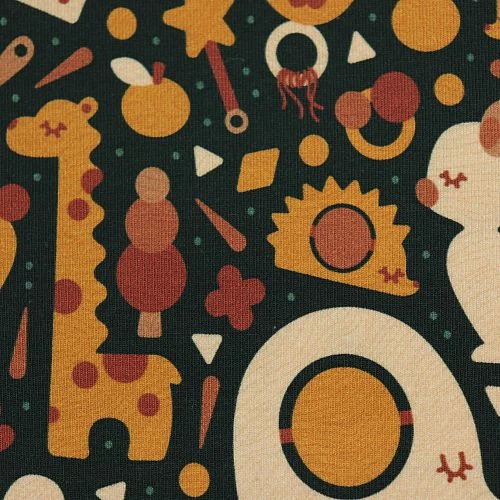 Mit seinem Motiv voller Babyspielzeuge, ist es ein richtig schöner Stoff für das erste Jahr. Die Farbe ist ein sehr dunkles Seetanggrün.