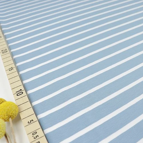 Die 15mm und 5mm breiten Streifen sind nicht gedruckt, sondern es wurde farbiges Garn verstrickt. Dadurch verliert der Stoff kaum Farbe und du hast länger Freude an deinem selbstgenähten Stoffschätzchen.