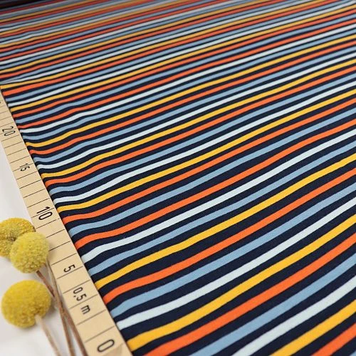 Die gedruckten Streifen verlaufen nicht klassich parallel, sondern haben leichte Wellen, was den Stoff sehr interessant macht.