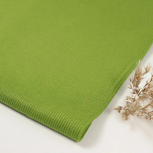 Der avocadogrüne uni Strickstoff hat eine Oberseite aus Strick mit Rippenmuster und eine glatte Unterseite für ein anschmiegsames Gefühl. Außerdem wird der Strick dadurch stabilisiert und kann so nicht ausleiern.